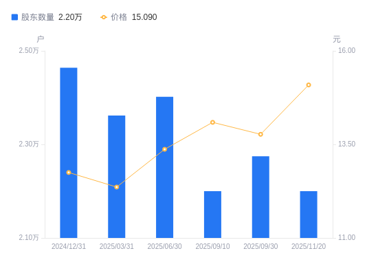近一年(2024年12月31日至2025年11月20日),嘉事堂A股股东户数从2.46万户,减低至2.2万户,降幅10.71%,区间股价上涨15.81%。