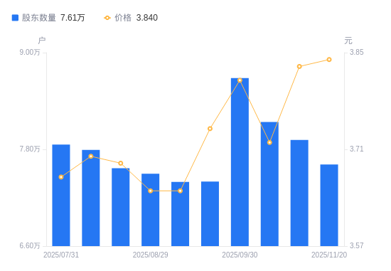 近一年(2024年11月20日至2025年11月20日),广东建工A股股东户数从8.23万户,减低至7.61万户,降幅7.48%,区间股价上涨2.67%。
