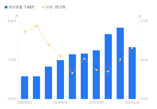 近一年(2024年11月20日至2025年11月20日),北新建材A股股东户数从5.3万户,增加至7.6万户,增幅43.40%,区间股价下跌10.91%。