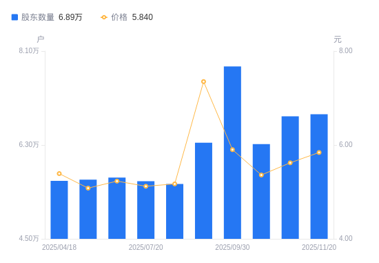 近一年(2024年11月20日至2025年11月20日),云南旅游A股股东户数从5.14万户,增加至6.89万户,增幅33.95%,区间股价上涨8.55%。