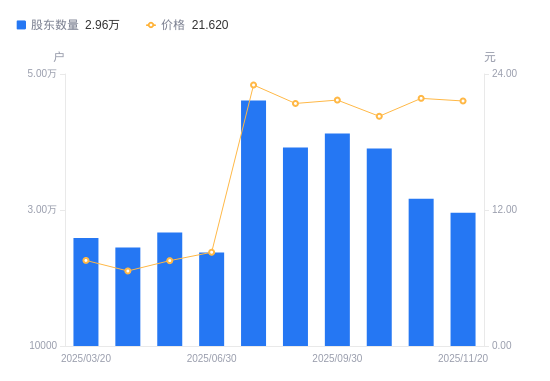 近一年(2024年12月20日至2025年11月20日),东杰智能A股股东户数从2.73万户,增加至2.96万户,增幅8.33%,区间股价上涨185.98%。
