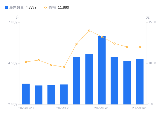 近一年(2024年12月20日至2025年11月20日),中山公用A股股东户数从3.79万户,增加至4.77万户,增幅26.07%,区间股价上涨38.29%。