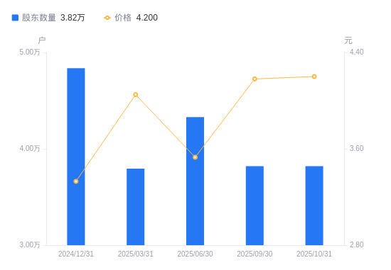 近一年(2024年12月31日至2025年10月31日),新钢股份A股股东户数从4.84万户,减低至3.82万户,降幅21.04%,区间股价上涨25.37%。