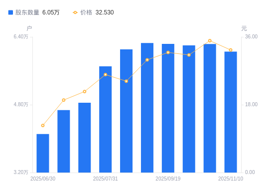 近一年(2024年11月29日至2025年10月31日),铜冠铜箔A股股东户数从4.13万户,增加至6.23万户,增幅50.93%,区间股价上涨219.05%。