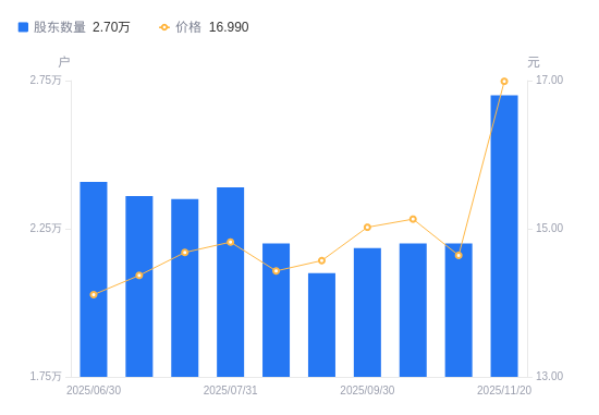 近一年(2024年12月20日至2025年11月20日),濮阳惠成A股股东户数2.7万户保持不变,区间股价上涨0.34%。
