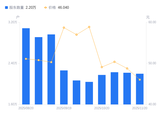 近一年(2024年11月20日至2025年11月20日),电连技术A股股东户数从1.73万户,增加至2.2万户,增幅26.74%,区间股价下跌8.68%。