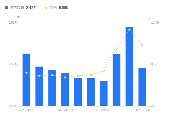 近一年(2024年12月20日至2025年11月20日),标准股份A股股东户数从1.81万户,增加至2.42万户,增幅33.70%,区间股价上涨79.17%。