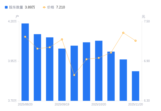 近一年(2024年12月31日至2025年11月20日),新农开发A股股东户数从4.47万户,减低至3.89万户,降幅13.14%,区间股价上涨10.75%。