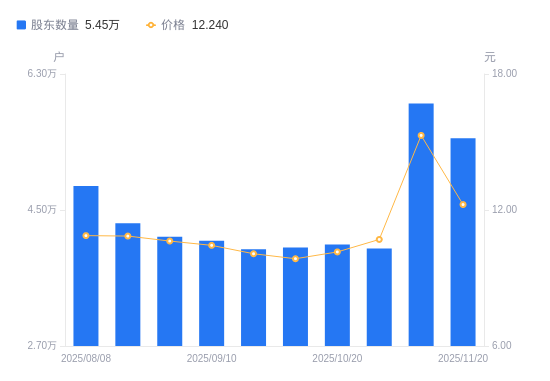 近一年(2024年11月20日至2025年11月20日),闽东电力A股股东户数从4.68万户,增加至5.45万户,增幅16.37%,区间股价上涨34.95%。
