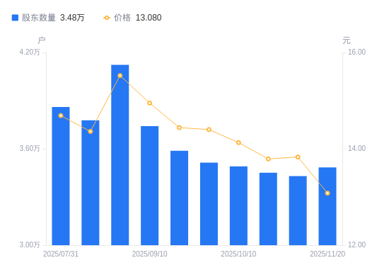 近一年(2024年11月20日至2025年11月10日),皇台酒业A股股东户数从4.12万户,减低至3.43万户,降幅16.80%,区间股价上涨0.95%。