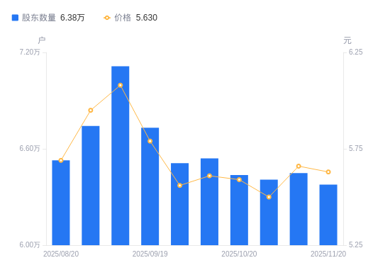 近一年(2024年11月29日至2025年11月10日),红旗连锁A股股东户数从4.9万户,增加至6.45万户,增幅31.61%,区间股价上涨1.71%。