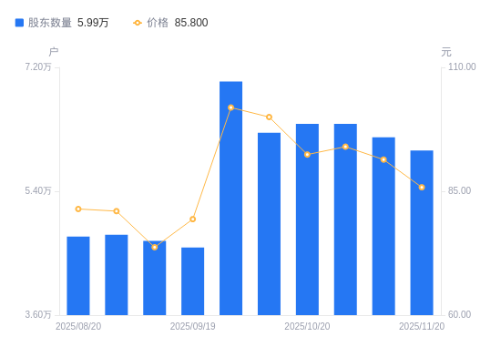 近一年(2024年11月20日至2025年11月10日),江丰电子A股股东户数从4.43万户,增加至6.18万户,增幅39.45%,区间股价上涨23.64%。