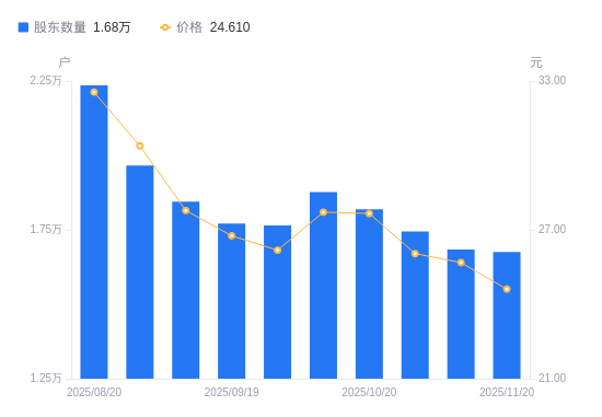 11月25日消息,数据显示,截至2025年11月20日,邵阳液压A股股东总户数为1.68万户,较上期(2025年11月10日)减少80户,降幅0.48%。公司最新A股总股本为1.09亿股,其中流通A股6952.52万股,户均持有流通A股数量为4148.78股,较上期增加19.71股,增幅0.48%;户均持流通A股市值10.21万元,较上期减少3933元,降幅3.71%。
