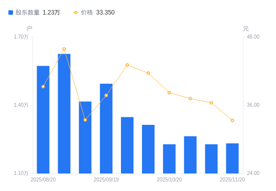 近一年(2024年11月20日至2025年11月20日),航天南湖A股股东户数从1.23万户,增加至1.23万户,增幅0.36%,区间股价上涨70.15%。