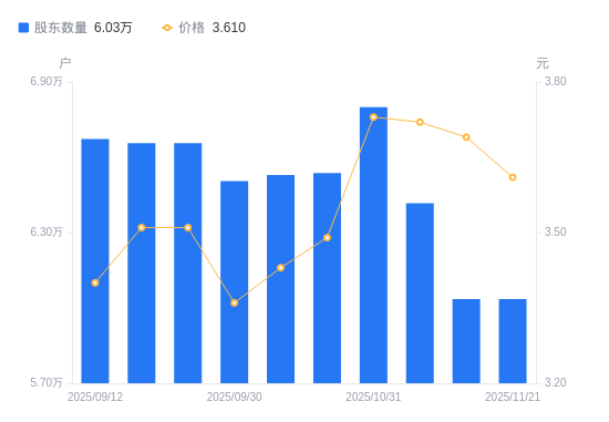 近一年(2024年11月30日至2025年11月21日),淮河能源A股股东户数从3.46万户,增加至6.03万户,增幅74.56%,区间股价下跌6.48%。