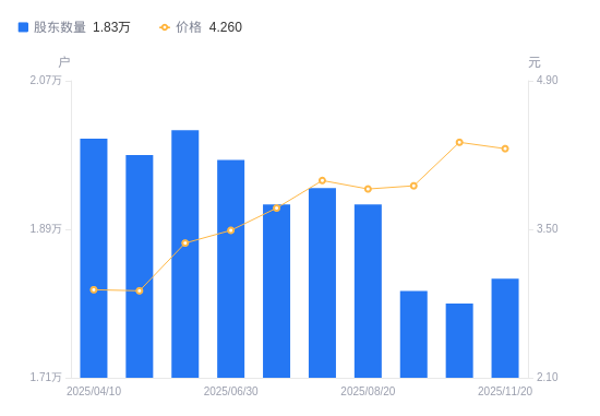 近一年(2024年11月20日至2025年11月20日),维尔利A股股东户数从2.17万户,减低至1.83万户,降幅15.67%,区间股价上涨5.71%。