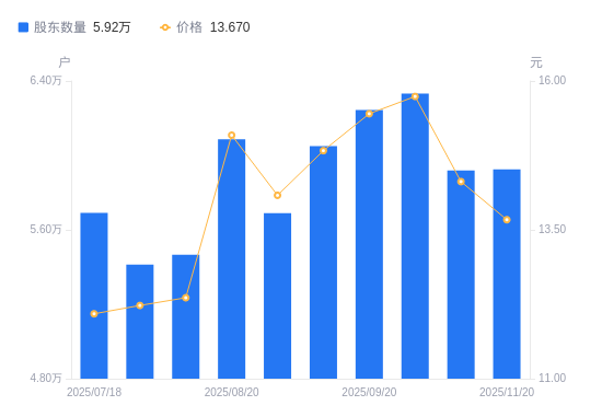 近一年(2024年11月20日至2025年11月20日),宝武镁业A股股东户数从5.25万户,增加至5.92万户,增幅12.84%,区间股价上涨29.08%。