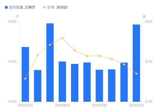 近一年(2024年11月20日至2025年11月20日),康弘药业A股股东户数从3.66万户,减低至2.96万户,降幅18.91%,区间股价上涨64.06%。