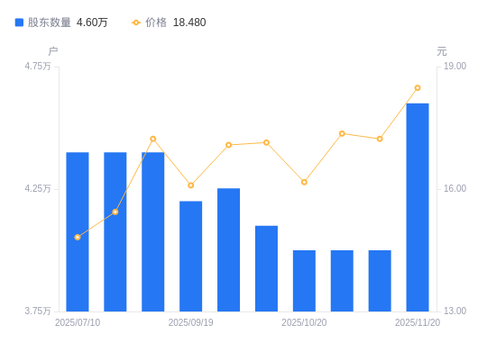 近一年(2024年11月20日至2025年11月20日),超图软件A股股东户数从4.68万户,减低至4.6万户,降幅1.71%,区间股价上涨0.65%。