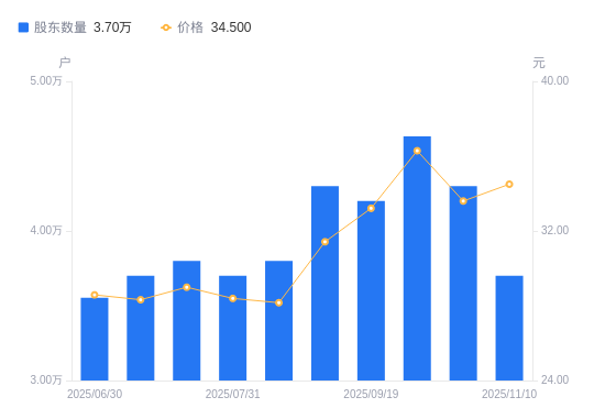 近一年(2024年11月20日至2025年11月10日),鼎龙股份A股股东户数3.7万户保持不变,区间股价上涨25.59%。