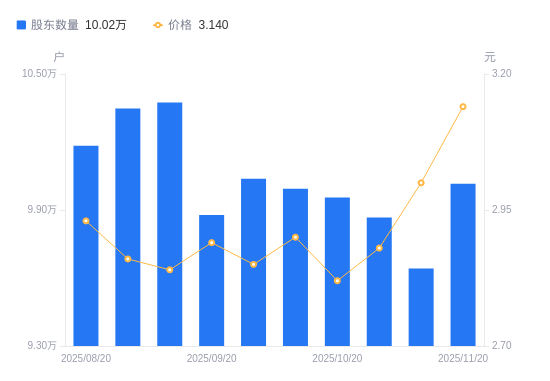 近一年(2024年11月29日至2025年11月20日),神州高铁A股股东户数从9.18万户,增加至10.02万户,增幅9.08%,区间股价上涨25.60%。