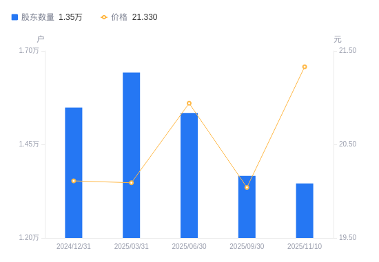 11月26日消息,数据显示,截至2025年11月10日,健麾信息A股股东总户数为1.35万户,较上期(2025年9月30日)减少202户,降幅1.48%。公司最新A股总股本为1.36亿股,其中流通A股1.36亿股,户均持有流通A股数量为1.01万股,较上期增加149.5股,增幅1.50%;户均持流通A股市值21.56万元,较上期增加1.6万元,增幅8.04%。