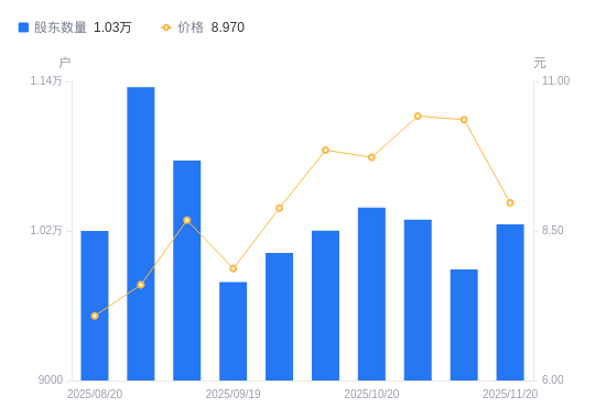 近一年(2024年11月20日至2025年11月20日),*ST聆达A股股东户数从1.34万户,减低至1.03万户,降幅23.77%,区间股价上涨58.76%。