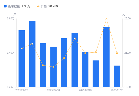 近一年(2024年11月29日至2025年11月20日),东方环宇A股股东户数从2.02万户,减低至1.33万户,降幅34.42%,区间股价下跌1.32%。