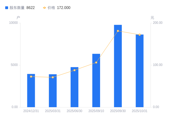 近一年(2024年12月31日至2025年10月31日),精智达A股股东户数从3942户,增加至8622户,增幅118.72%,区间股价上涨124.83%。