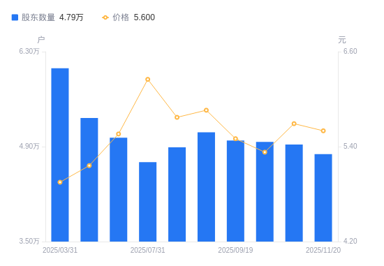 近一年(2024年12月31日至2025年11月20日),东北制药A股股东户数从6.49万户,减低至4.79万户,降幅26.21%,区间股价上涨6.46%。