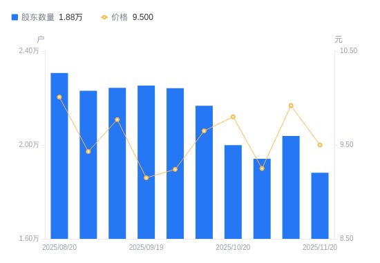 近一年(2024年11月20日至2025年11月20日),麦趣尔A股股东户数从2.46万户,减低至1.88万户,降幅23.52%,区间股价上涨19.50%。
