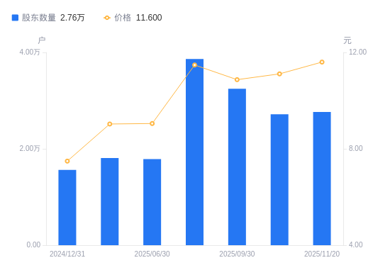 近一年(2024年12月31日至2025年11月20日),法兰泰克A股股东户数从1.56万户,增加至2.76万户,增幅76.80%,区间股价上涨51.24%。