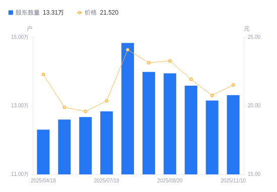 近一年(2024年11月20日至2025年11月20日),智飞生物A股股东户数从13.36万户,减低至13.01万户,降幅2.64%,区间股价下跌29.66%。