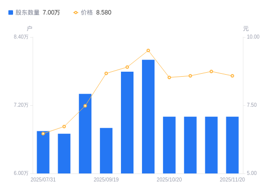 近一年(2024年12月31日至2025年11月20日),天富能源A股股东户数从7.63万户,减低至7万户,降幅8.23%,区间股价上涨30.69%。