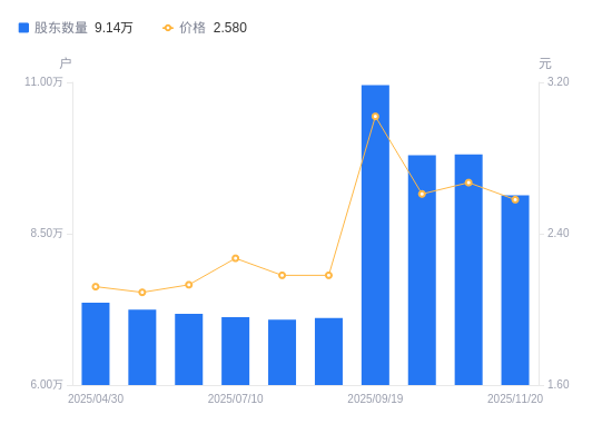 近一年(2024年11月20日至2025年11月20日),苏宁环球A股股东户数从7.77万户,增加至9.14万户,增幅17.52%,区间股价上涨7.95%。
