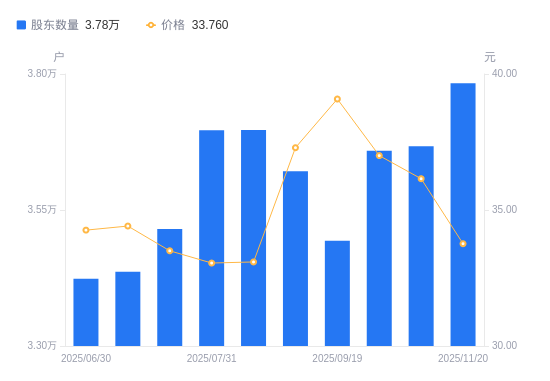 近一年(2024年11月29日至2025年11月20日),亿联网络A股股东户数从3.55万户,增加至3.78万户,增幅6.43%,区间股价下跌4.96%。
