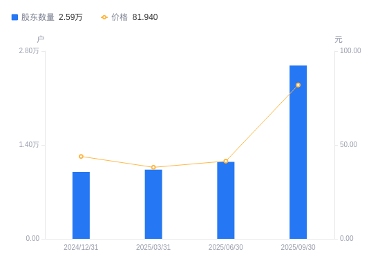 11月28日消息,数据显示,截至2025年10月31日,聚和材料A股股东总户数为2.22万户,较上期(2025年9月30日)减少3634户,降幅14.05%。公司最新A股总股本为2.42亿股,其中流通A股1.81亿股,户均持有流通A股数量为8130股,较上期增加1142.65股,增幅16.35%;户均持流通A股市值48.41万元,较上期减少8.84万元,降幅15.44%。