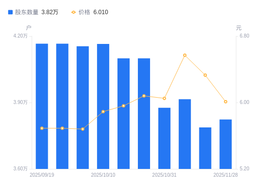 11月29日消息,数据显示,截至2025年11月28日,国际实业A股股东总户数为3.82万户,较上期(2025年11月20日)增加362户,增幅0.96%。公司最新A股总股本为4.81亿股,其中流通A股4.81亿股,户均持有流通A股数量为1.26万股,较上期减少120.16股,降幅0.95%;户均持流通A股市值7.56万元,较上期减少4783.37元,降幅5.95%。