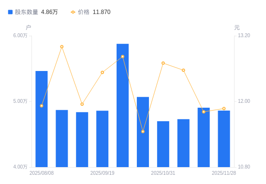 近一年(2024年11月20日至2025年11月20日),麦捷科技A股股东户数从5.61万户,减低至4.9万户,降幅12.60%,区间股价下跌8.98%。