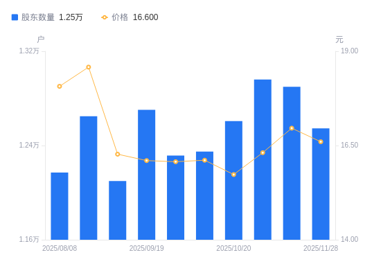 近一年(2024年12月31日至2025年11月28日),锐新科技A股股东户数从1.87万户,减低至1.25万户,降幅32.89%,区间股价上涨6.05%。