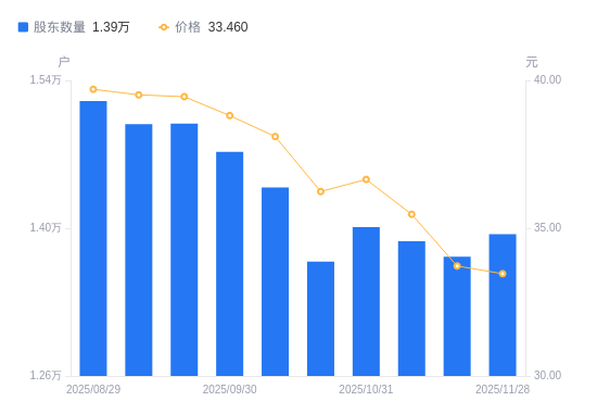 近一年(2024年11月29日至2025年11月28日),博硕科技A股股东户数从1.47万户,减低至1.39万户,降幅5.21%,区间股价上涨13.36%。