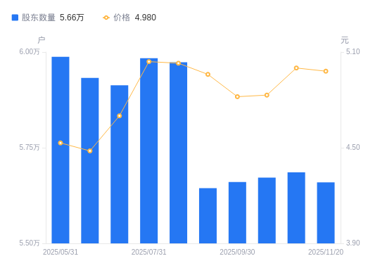 近一年(2024年11月20日至2025年11月10日),齐翔腾达A股股东户数从6.32万户,减低至5.69万户,降幅10.03%,区间股价下跌6.38%。