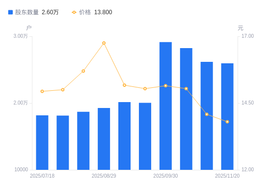 近一年(2024年11月20日至2025年11月20日),威星智能A股股东户数从1.89万户,增加至2.6万户,增幅37.71%,区间股价下跌25.24%。