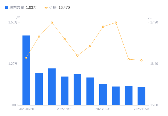 近一年(2024年12月31日至2025年11月28日),东利机械A股股东户数从1.08万户,减低至1.03万户,降幅4.38%,区间股价上涨20.88%。