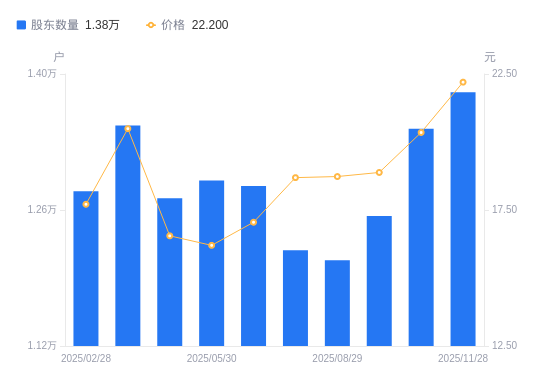 近一年(2024年11月29日至2025年11月28日),康斯特A股股东户数从1.29万户,增加至1.38万户,增幅7.25%,区间股价上涨37.55%。