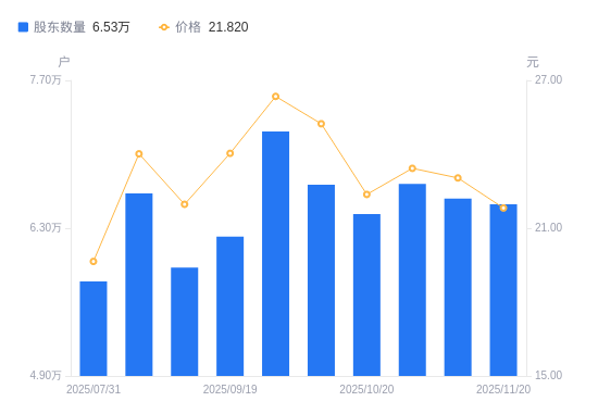 近一年(2024年11月29日至2025年11月20日),飞凯材料A股股东户数从5.98万户,增加至6.53万户,增幅9.20%,区间股价上涨20.06%。