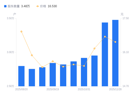 近一年(2024年11月29日至2025年11月28日),炬华科技A股股东户数从2.65万户,增加至3.48万户,增幅31.41%,区间股价上涨3.83%。