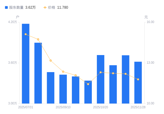 近一年(2024年11月29日至2025年11月28日),赛升药业A股股东户数从2.76万户,增加至3.62万户,增幅31.26%,区间股价上涨45.07%。