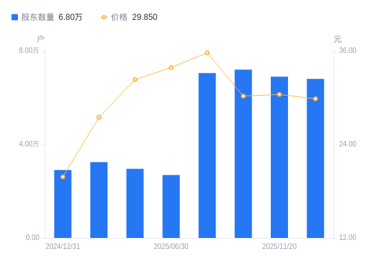 近一年(2024年12月31日至2025年11月30日),禾望电气A股股东户数从2.91万户,增加至6.8万户,增幅134.00%,区间股价上涨43.30%。