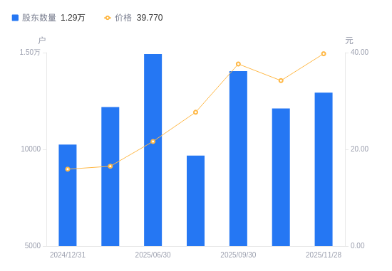 近一年(2024年12月31日至2025年11月28日),长华化学A股股东户数从1.02万户,增加至1.29万户,增幅26.20%,区间股价上涨145.13%。
